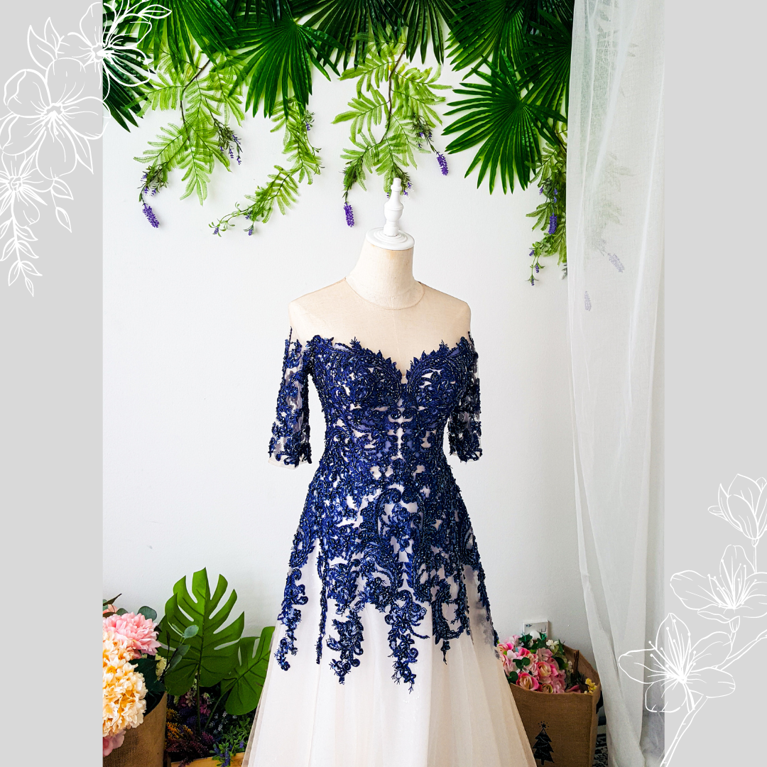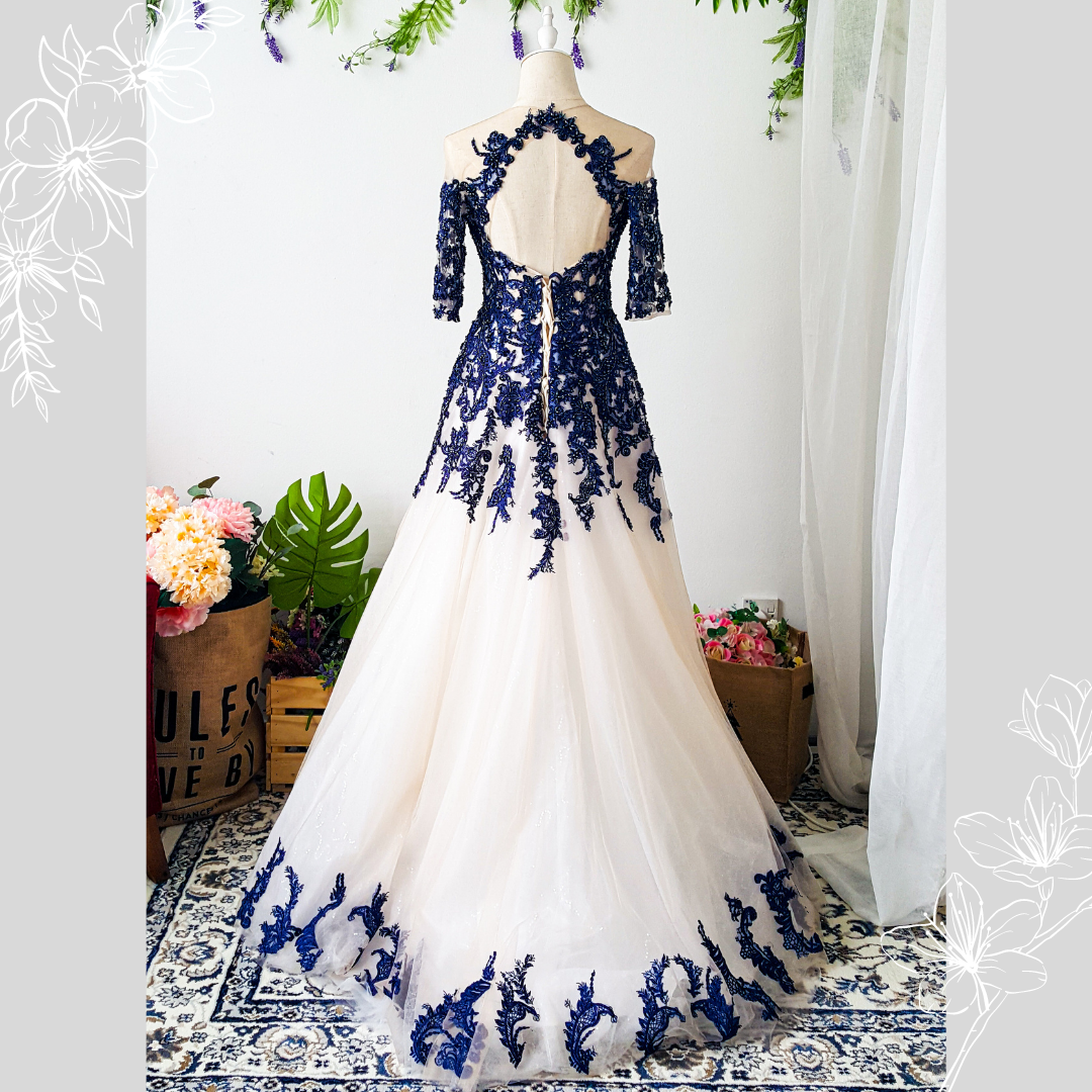 Evening Dress 801LLEL01 Plus Shirla Blue Quater sleeves Champange with blue lace A line  Plus size Bride Event Reception Dinner Dress rental Malaysia d