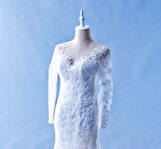 Long sleeves wedding dress in French Alencon lace in Trumpet style.