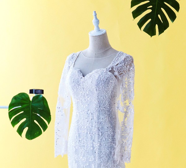 Long sleeves weding dress in trumpet fully embroidered in luscious Spanish lace. Sexy keyhole back details with a detachable back cover to convert it into a conservative covered back dress suitable for church wedding or muslimah wedding/majlis perkahwinan.