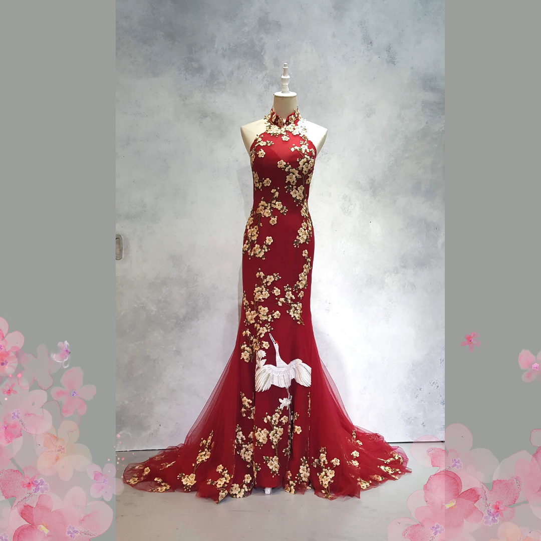 219EL01E04 Ray Cheongsam Red Crane Halter 8 Oriental Cheong Sam Qi Pao rental Malaysia Kuala Lumpur Petaling Jaya