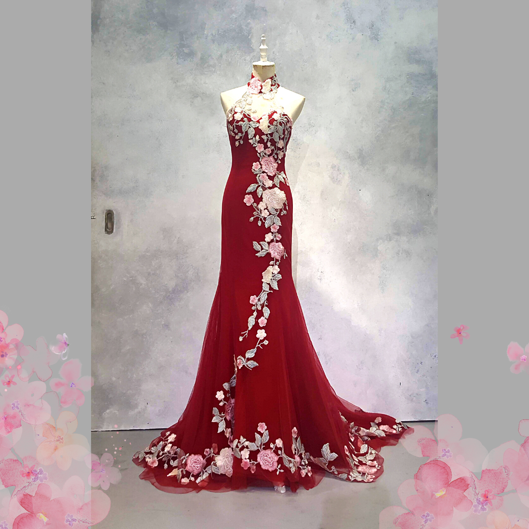 Evening Dress CC610E04 Red Halter Back illusion French Lace Chiffon 39 Oriental Cheong Sam Qi Pao rental Malaysia Kuala Lumpur Petaling Jaya