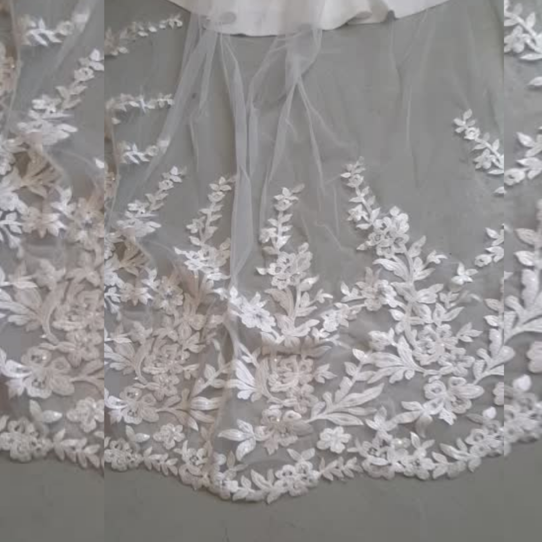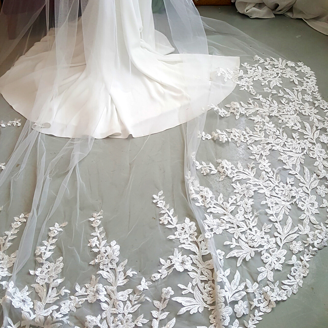Type of Lace: French Guipure Lace with sparkly sequins, Full Lace along the train of the veil, front is clear