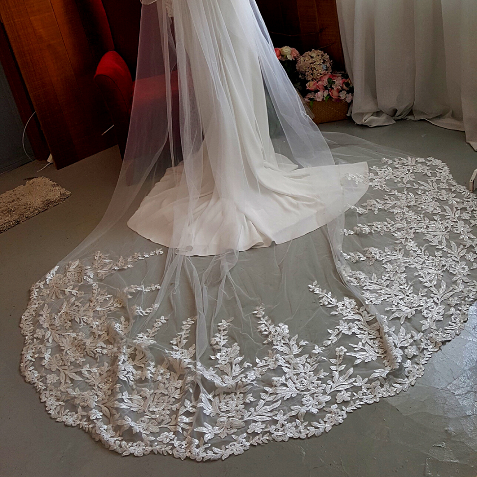 VT011c TWD Premium Bride Wedding Veil Full Guipure Embroidered Floral Lace Long Cathedral Length Soft Tulle Net Finger Tip With Comb/Veil Tudung Pengantin Nikah Sanding