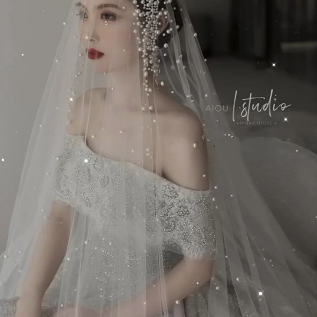 VTCM012b TWD Premium Bride Wedding Veil Single Layer Full Pearl Mid Length Short Soft Tulle Net Finger Tip no Comb/Veil Tudung Pengantin Nikah Sanding