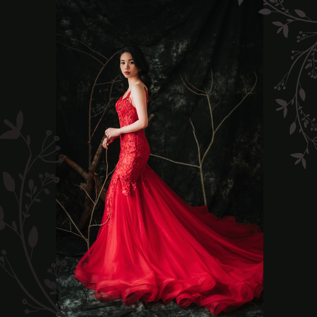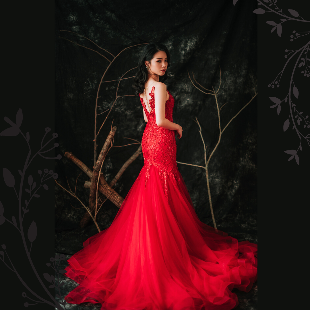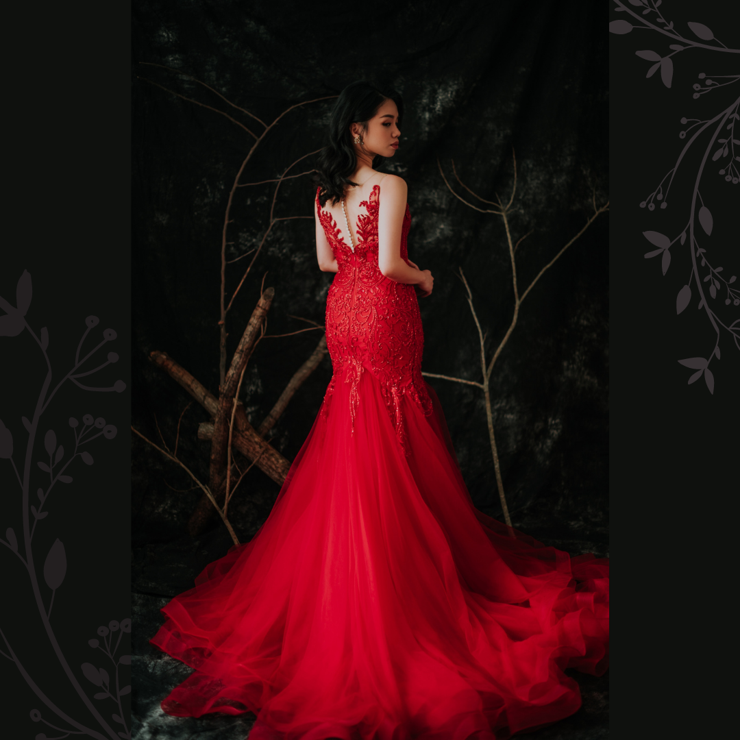 910LLW04 Winona Red Spag strap deep V baroque trumpet 2 Bride Wedding Event Reception Dinner Dress rental Malaysia