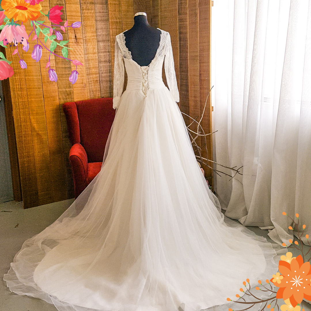 Featuring a beautiful lace embroidery with elegant beading details, this gorgeous wedding dress is both elegant and timeless!
