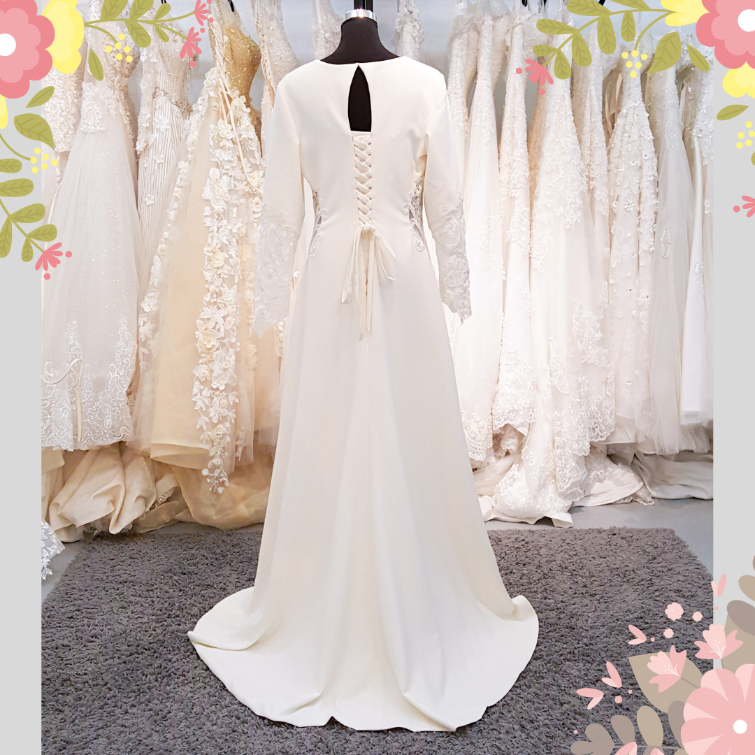 910BY05WL01 Yarrie PLUS  LS Crepe Plain Cut out Waist 2 Plus Size Bride Malaysia Dress Rental, Simple wedding dress malaysia, ROM wedding gown Kuala Lumpur,