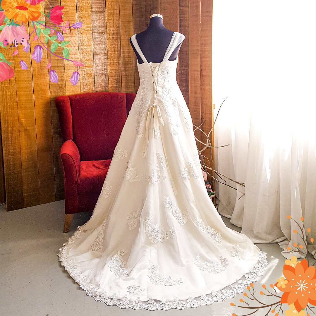 Featuring a beautiful lace embroidery with elegant beading details, this gorgeous wedding dress is both elegant and timeless!