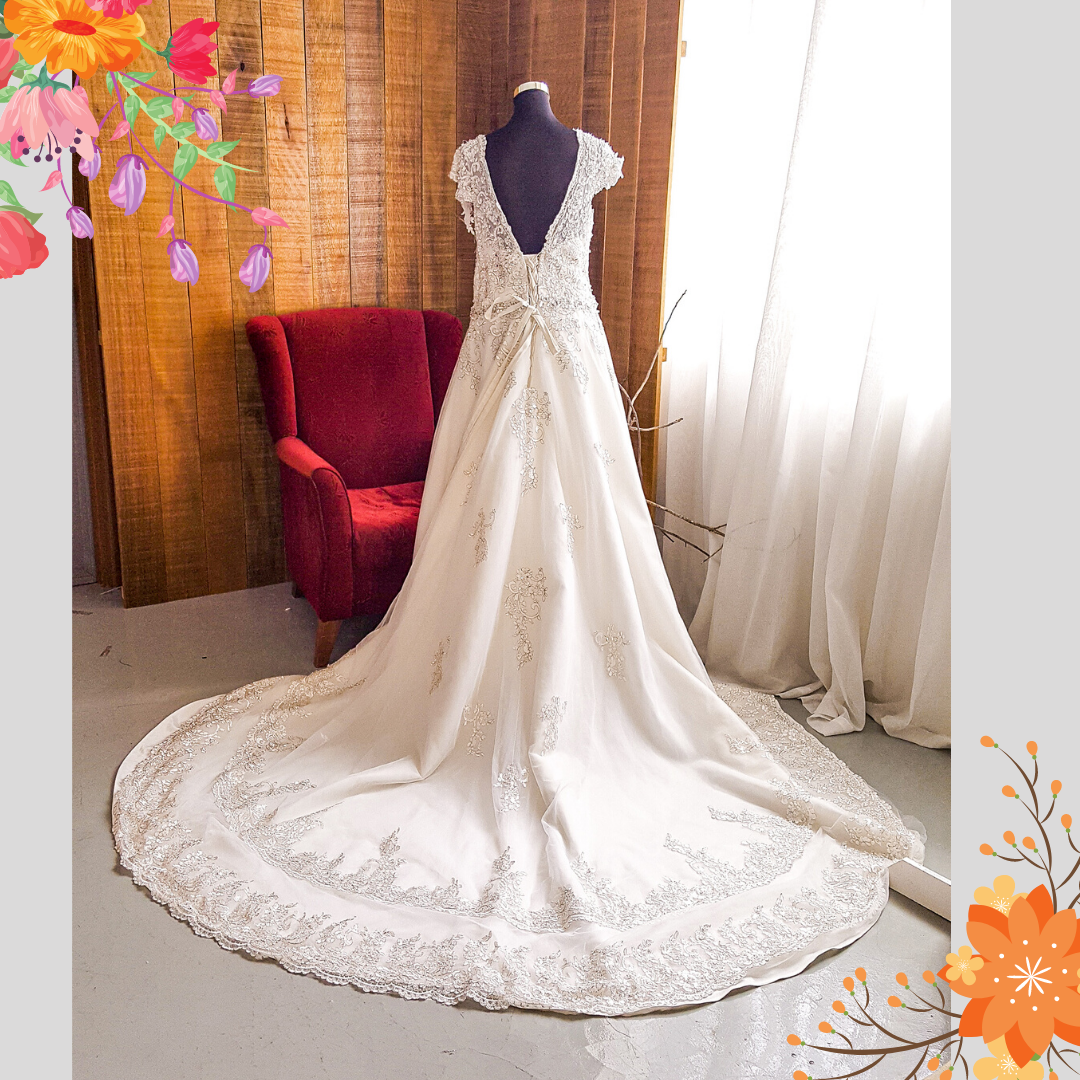 Featuring a beautiful lace embroidery with elegant beading details, this gorgeous wedding dress is both elegant and timeless!