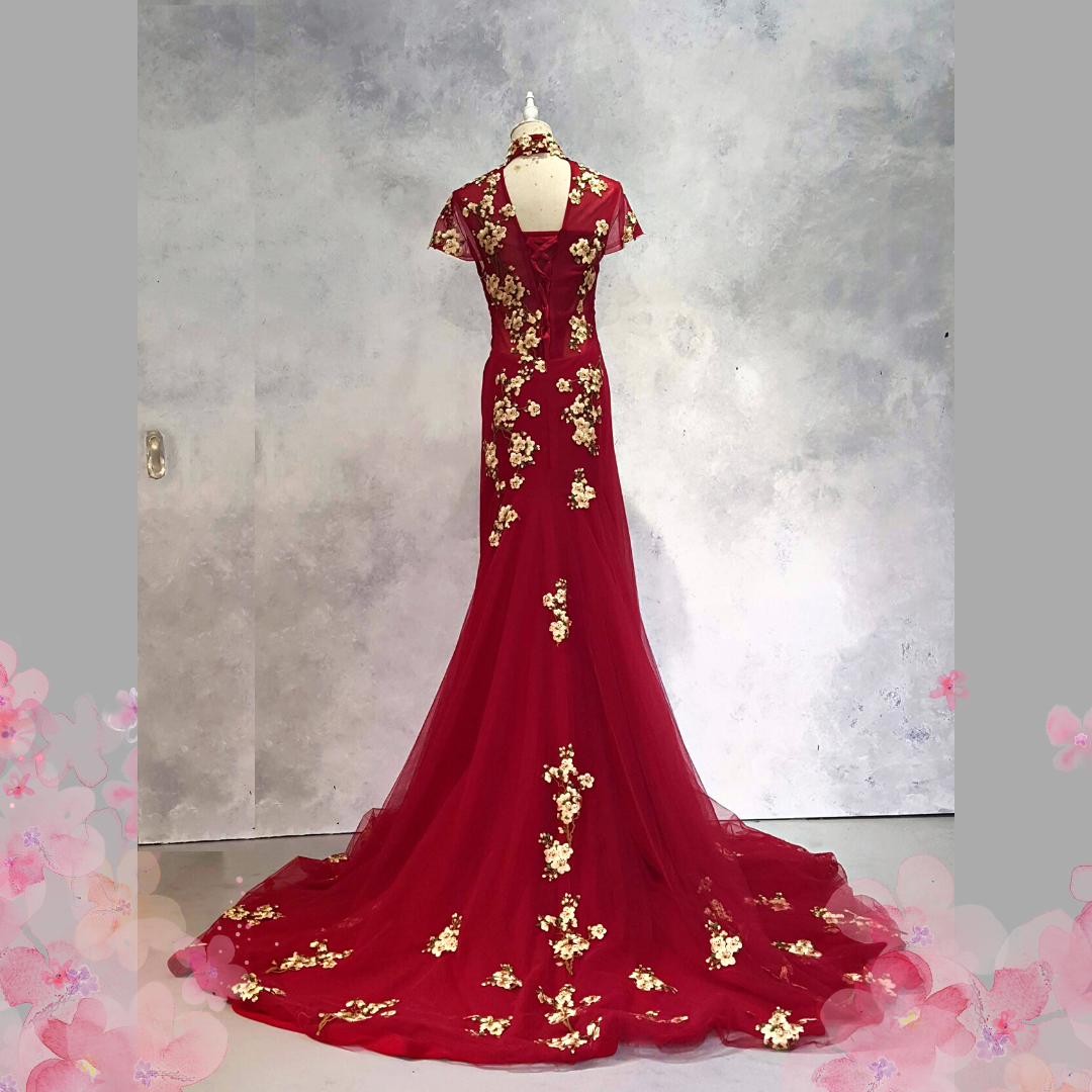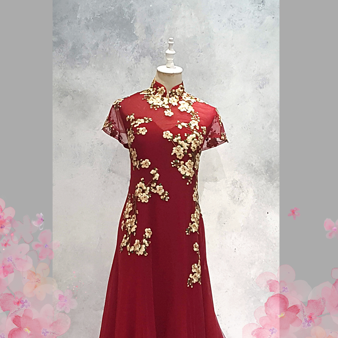 222EL03EL01 Cherry PLUS Cheongsam Red Cherry Blossom Oriental Cheong Sam Qi Pao rental Malaysia Kuala Lumpur Petaling Jaya Evening Dress