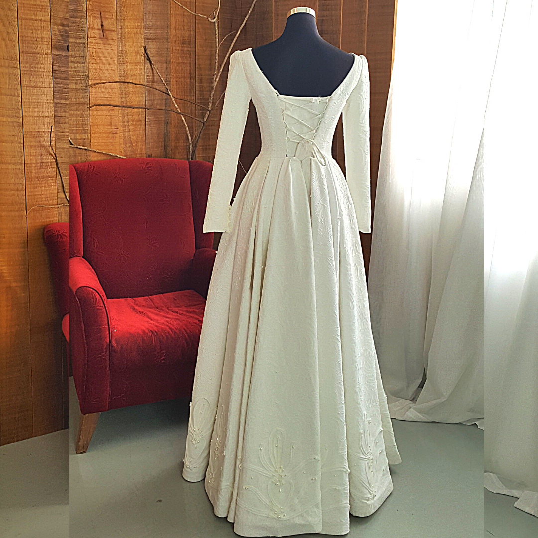 Couture design long sleeves V neck wedding dress in A line featuring lush Textured Satin Skirt.