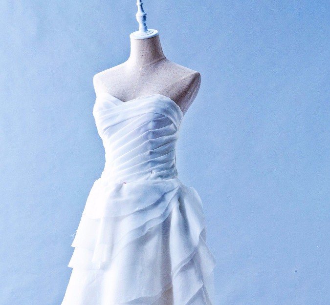 Sweet heart pleated bodice wedding dress in silk organza. Cute layerd ruffles train in Cathedral length.