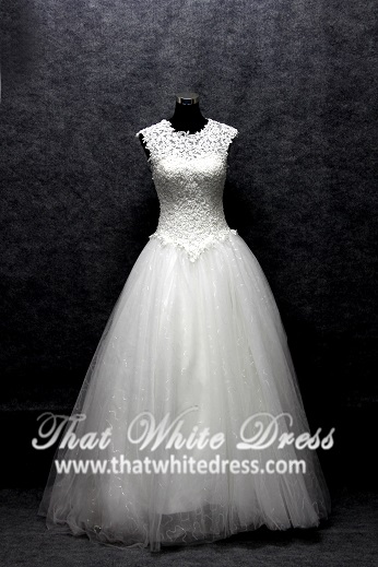 Korean inspired design with floral guipure lace illusion neckline, a clinched V shape waist that accentuate your curves and a soft fluffy tulle skirt.