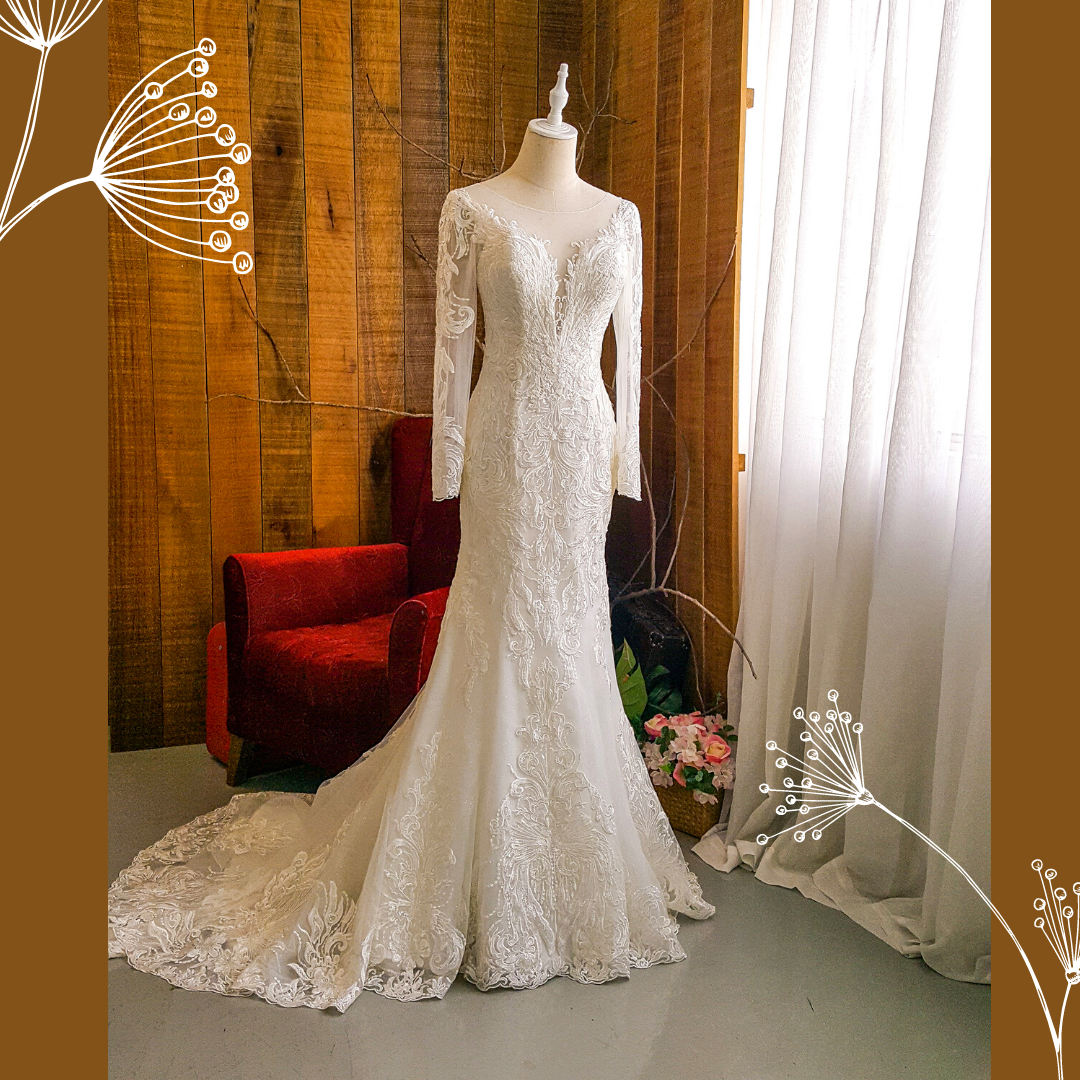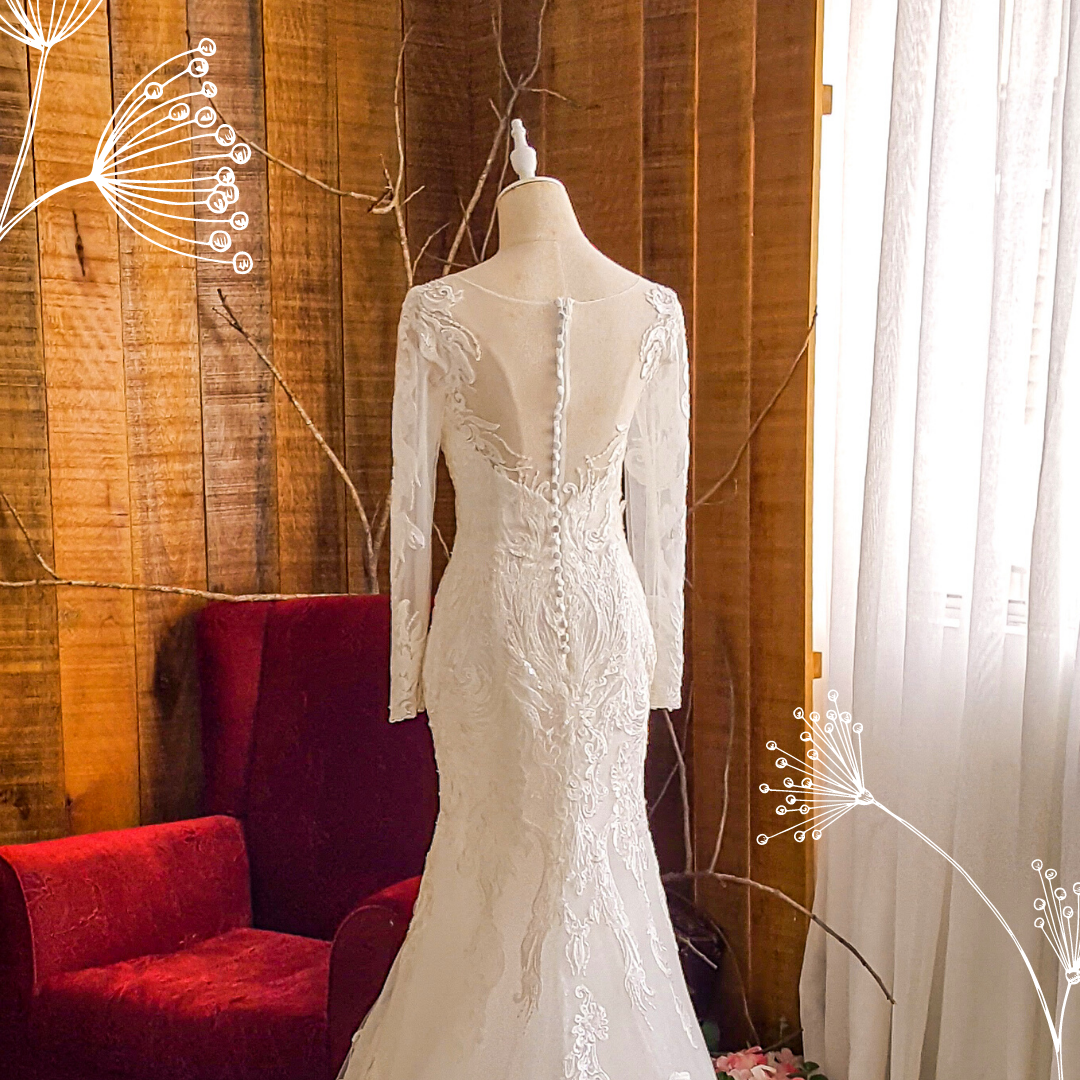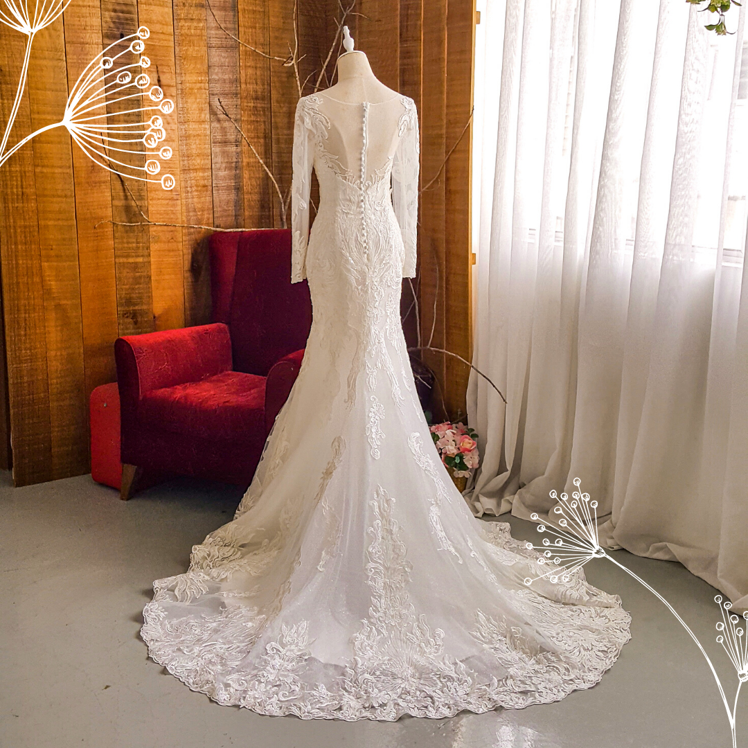 203BYW04 Valeena Long Sleeves Baroque Trumpet zip illusion off shoulder f button back Gaun Pengantin Muslimah Malaysia sewa Kahwin Nikah